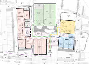 bâtiment de 1304 m2 de surfaces utiles, comprenant bibliothèque et cyber centre, un pôle sportif (salle de tir et billon) un pôle musique (salles de formations pratiques et théoriques, salle de répétition), un pôle locaux associatifs, et administratif, l’accueil (sas, hall détente et bar)-